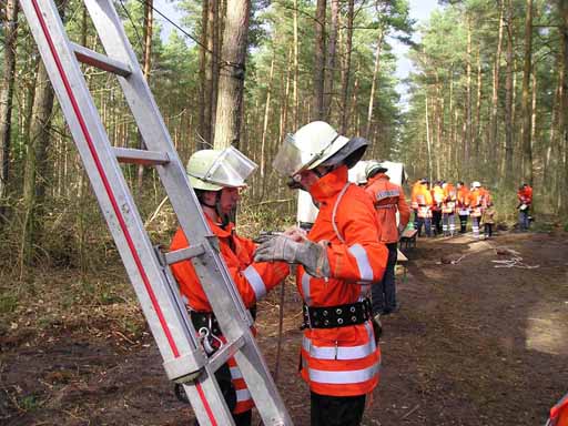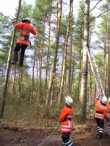 Hier mussten zwei Feuerwehrmänner in einer vorgegebenen Zeit die Strecke zwischen zwei Bäumen auf Drahtseilen überwinden, natürlich durch eine Feuerwehrleine gesichert.